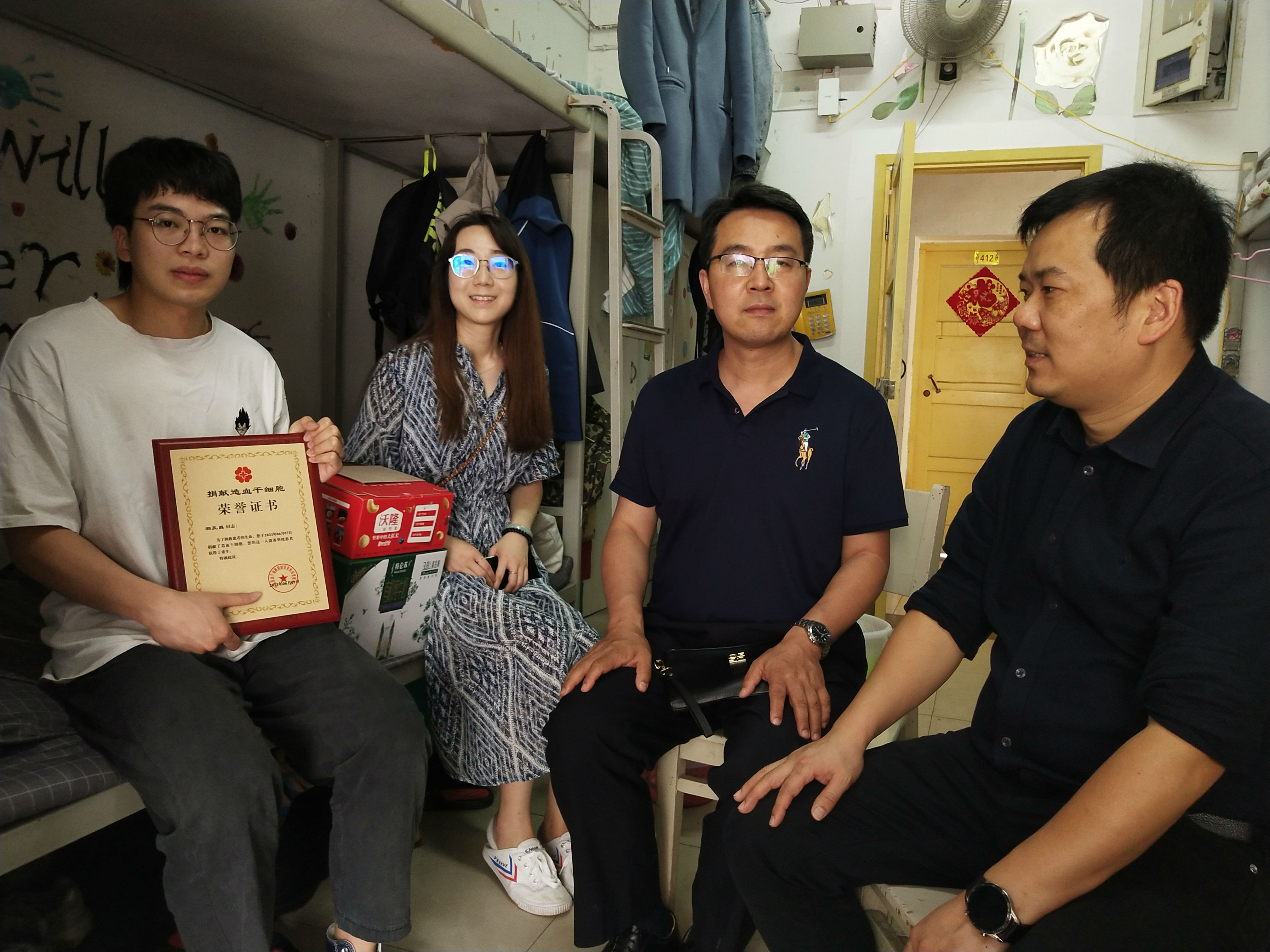 员工返校后,公司党委书记张袁松、副书记朱高峰、辅导员鲁萍第一时间到寝室去看望了羽孔昌同学,嘱咐他注意休息,并送上了牛奶、坚果、慰问金等物品。