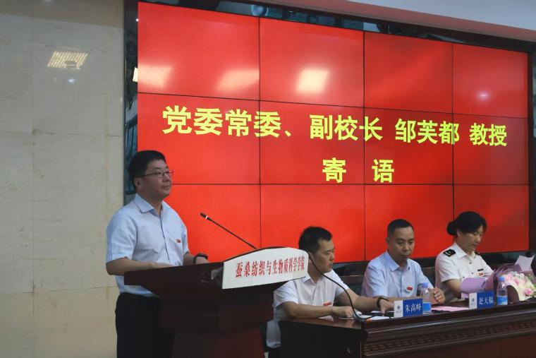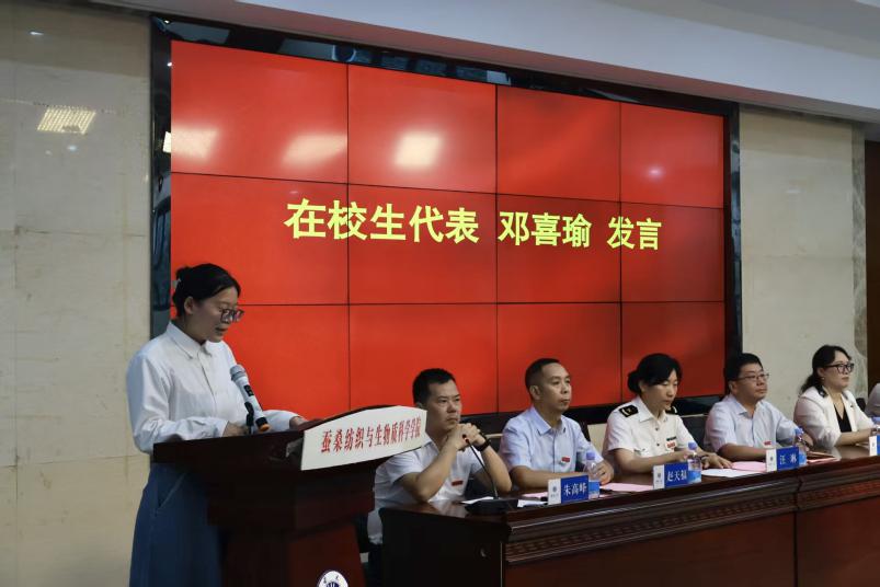 在校生代表、院员工会主席邓喜瑜同学以“青春织梦,薪火相传”为题,致敬学长学姐们用奋斗“编织青春经纬”的榜样力量,感念他们以星光点亮后学航程,并承诺将传承“含弘光大,继往开来”的西大精神。
