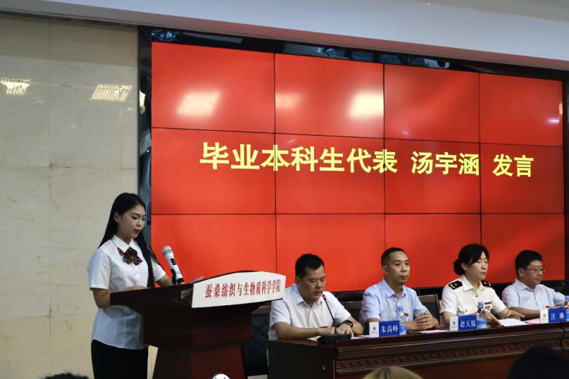 毕业本科生代表蚕学专业汤宇涵以“追光而行的力量”为主题,深情讲述了大学四年的“蜕变”历程:开眼界之光铸凌云之志、沐师友之光感润物之恩、承亲恩之光念港湾之暖、燃热血之光担时代之责;鼓励同学以豁达心态面对未来。
