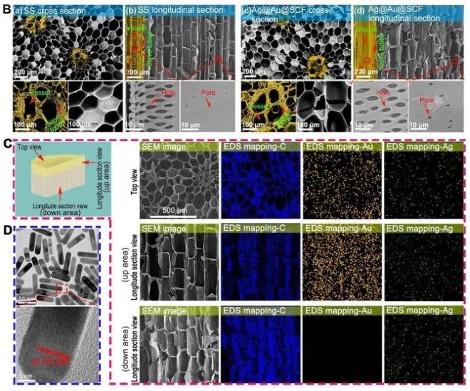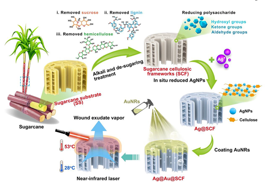 该团队通过模拟植物蒸腾作用,仿生甘蔗天然结构,同时结合纳米金棒和纳米银的处理,制备出能够持续导出渗出液,维持伤口适度湿润微环境而促进伤口愈合的甘蔗基海绵材料。此研究成果也是第一次利用甘蔗茎基结构,制备具有隔热性能的伤口渗出液管理系统,为利用天然材料调节渗出液提供新思路。