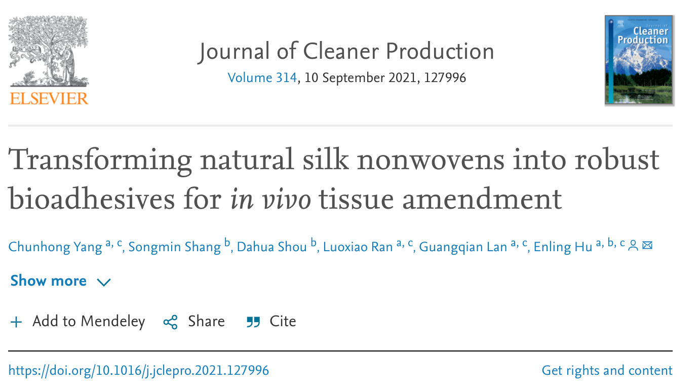 发布时间: 2021-08-31 13:05:27 已阅读:近日,伟德BV1946官网Bio-road生物医用材料研发团队在生态类旗舰期刊《Journal of CleanerProduction》(影响因子:9.297)上发表题为“Transforming natural silknonwovens into robust bioadhesives for in vivo tissue amendment”(由天然丝非织造布转化为可用于体内组织修复的生物粘合剂)的研究成果。该成果报道了一种将具有非织造布结构的天然桑蚕茧转化为可用于组织修复的生物粘合剂的方法。该方法不同于传统的将蚕丝纤维完全溶解得到蚕丝蛋白的方法。而是先用三元溶液(CaCl2 -乙醇- H2O)预处理桑蚕茧得到柔软透明的蚕茧片,然后用氯化钙-甲酸溶液进行表面改性得到具有高粘性的生物粘合剂,该种生物粘合剂可用于组织修复与缝合,为传统的缝合方法开辟了一个新视野。