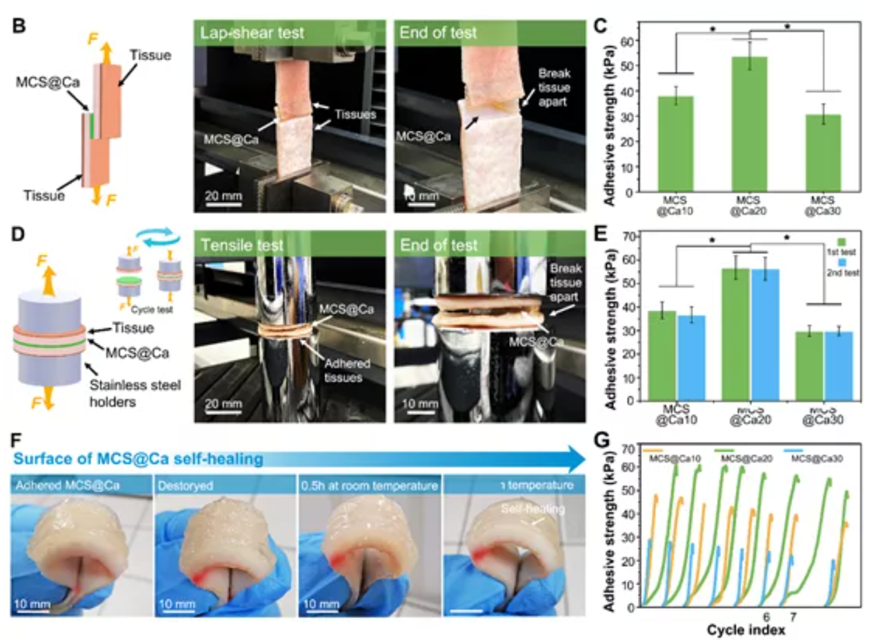 本研究通过一种简单的自上而下的改性方法,研发了一种具有高拉伸性、生物相容性和生物降解性的透明粘合剂,解决了传统缝合线的存在的问题。该种自上而下的方法不仅具有简单的优点,而且还保持了原始材料的完整性。而该粘合剂的最高粘附强度能够达到54 KPa。