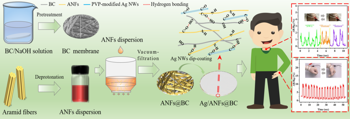 柔性可穿戴压力传感器在人机交互、仿生智能设备等领域极具应用价值,因而受到了人们的广泛关注。然而,压力传感器目前仍然存在着制备工艺复杂、基体材料力学性能不足、响应迟滞现象明显、灵敏度低以及易受极端环境影响的挑战。针对以上问题,该论文报道了一种细菌纤维素(BC)基高灵敏度压力传感器:首先,基于高性能合成纤维增强天然纤维的策略,采用真空抽滤自组装法制备了一种具有优异力学性能的芳纶纳米纤维@细菌纤维素(ANF@BC)纳米复合薄膜;然后,通过浸涂法将银纳米线(Ag NWs)负载到该薄膜表面,制得Ag/ANFs@BC功能化纳米复合薄膜;在此基础上,首次探讨了其用作压力传感器在监视人体运动领域的应用(见下图)。