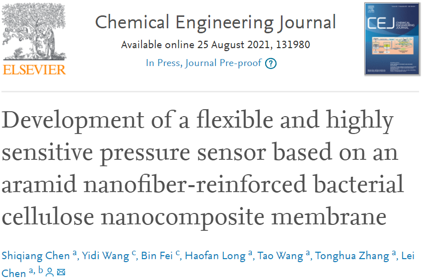 发布时间: 2021-09-05 10:43:15 已阅读:近日,公司陈磊副教授课题组在化学工程领域知名期刊《Chemical Engineering Journal》(IF:13.273)上发表题为“Development of a flexible and highly sensitive pressure sensor based on an aramid nanofiber-reinforced bacterial cellulose nanocomposite membrane”的研究论文。