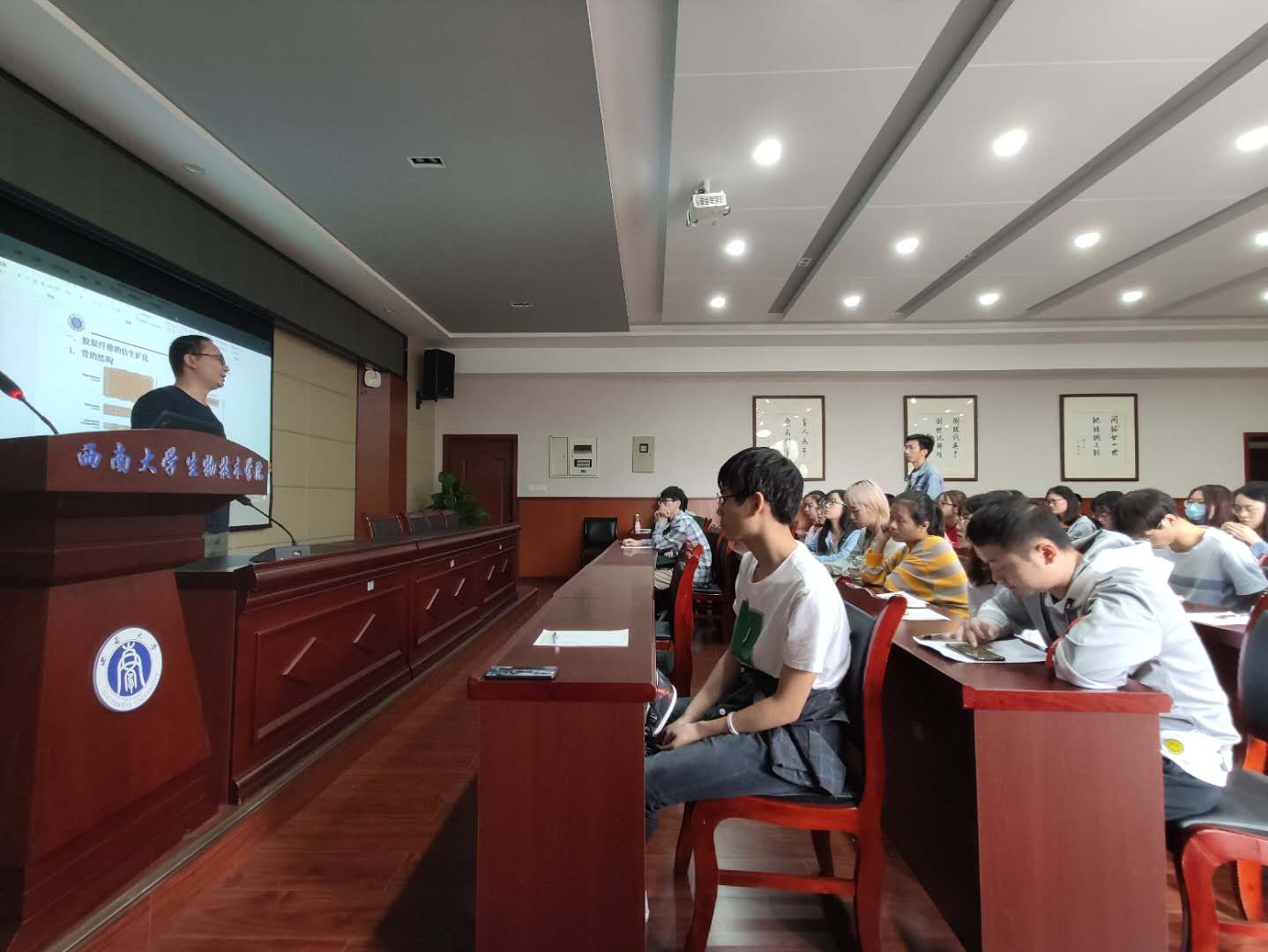 本次学术交流会公司共约100名师生参加,会上肖波老师首先作了美国乔治亚州立大学访学报告——茶叶衍生纳米粒子在结肠疾病治疗中的应用。