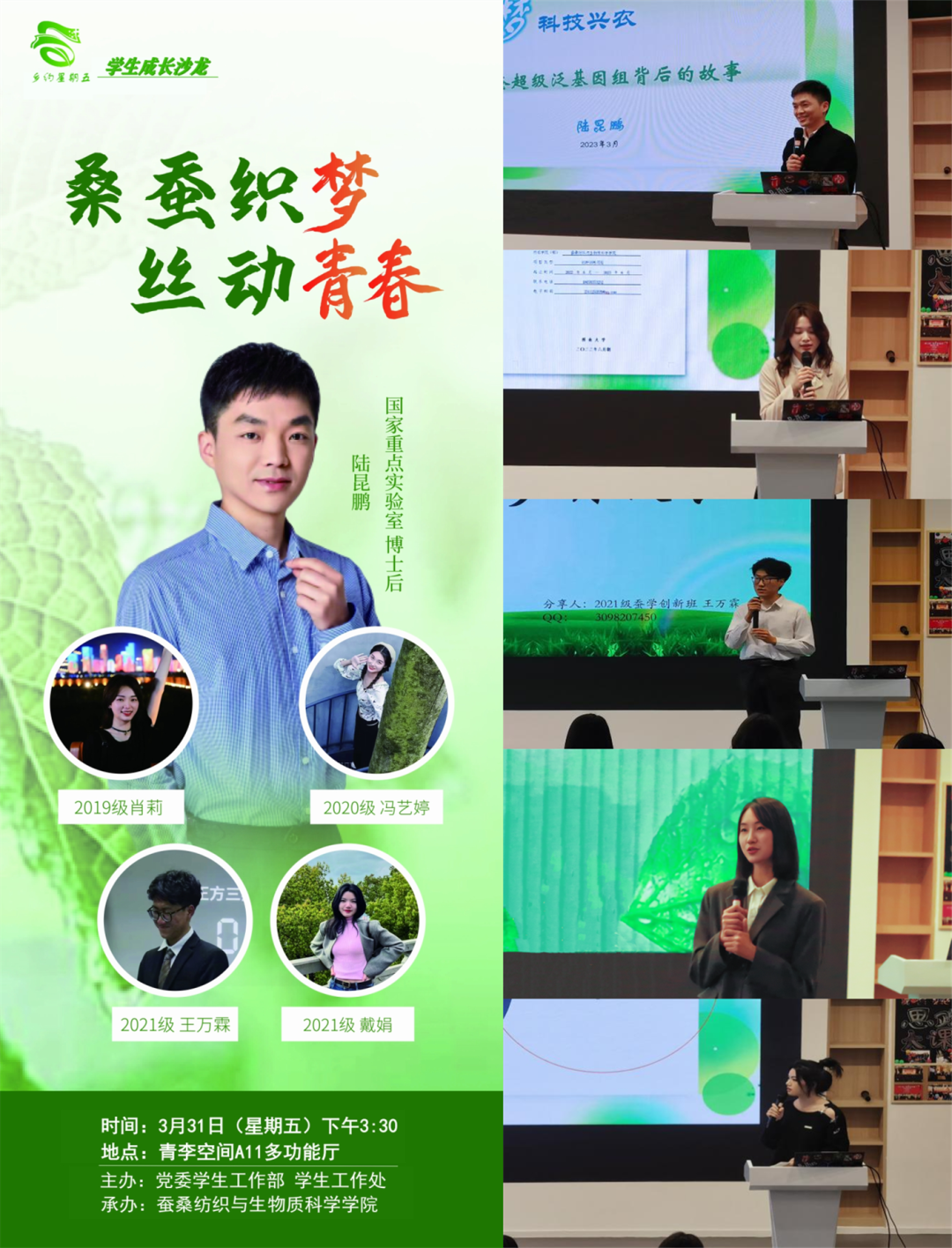 在听完学长学姐们的分享后,我体会到蚕桑文化的魅力所在,也更加深刻地理解了每一位蚕桑人对于蚕桑产业发展的责任,大学四年能做的远比想象中要多得多,我们应该有更清晰的目标和规划,为之努力,不负时光。