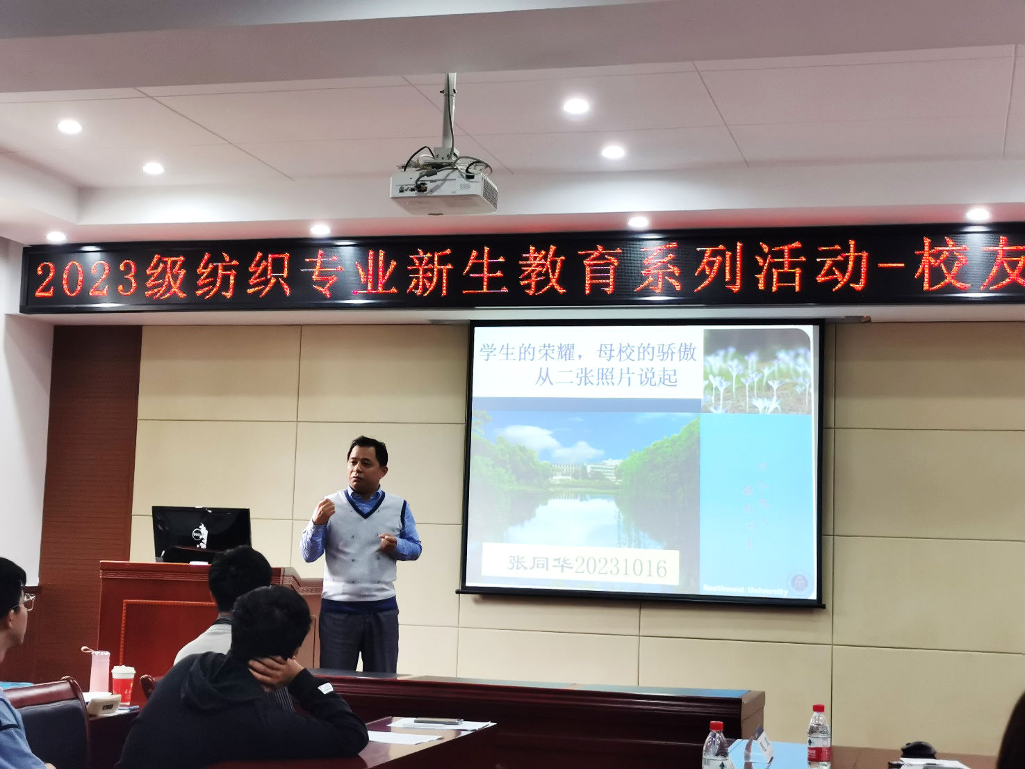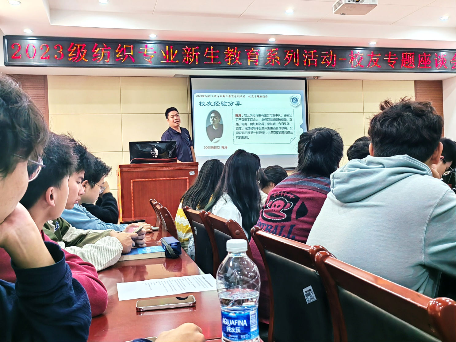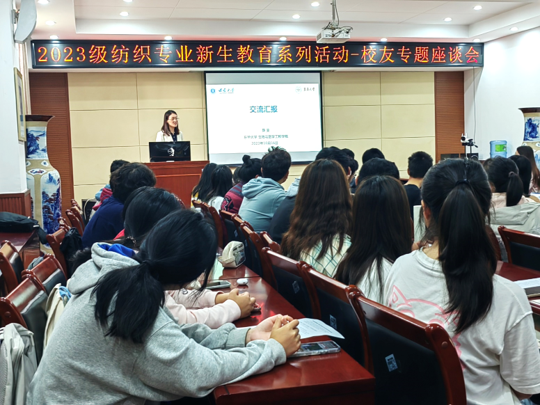 发布时间: 2023-10-23 09:58:29 已阅读: 为增强2023级纺织工程新生的专业认知,提高他们的专业自信,提升他们的学习热情与动力,10月16日上午8:00,纺织工程系在45教101报告厅开展了以“他们的今天,我们的明天”为主题的员工分享专题座谈会,分享会邀请了纺织工程专业的3位优秀毕业生代表:2010级毕业生、东华大学薛雯副教授,2008级毕业生、重庆工商大学文悦副教授,2008级毕业生、牧云文化传播有限公司陈涛董事长。