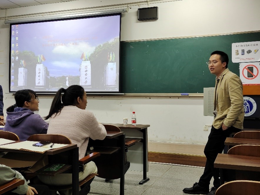 发布时间: 2021-10-20 11:46:23 已阅读:10月16日晚,受班主任徐立老师盛情邀请,重庆市劳模、重庆赛维药业有限公司质量总监、毕业于公司2005级蚕学的伍春师兄在33教203教室,向2021级生物技术类一班全体同学和部分研究生作了一次别开生面的交流报告会,让大家深深感受到如沐春风的殷殷师兄情和“革命尚未完成,同志仍需努力”的奋斗学习路。